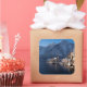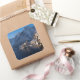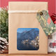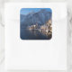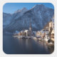 Square photo sticker with the town of Hallstatt covered in snow at the lakeside of the Hallstätter See lake with Alps mountains in the background in the first light of the sunrise in a winter landscape in Austria.