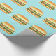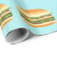 This wrapping paper features Destei's cartoon illustration of a hamburger. The burger is made of meat, green lettuce, red tomatoes, onion, slice of cheese and a few pickles. The bun looks freshly baked and it has some sesame seeds on top of it. The background colour is blue.