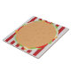 Features a hamburger with all the trimmings set on a red and white striped background.