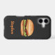An illustration of a hamburger that has a sesame seed bun that is filled with cheese, lettuce, beef, tomato, ketchup and pickles. There is also a personalizable text area for a name or other custom text. The background colour is dark, nearly black but not quite. Feel free to change the background colour to any other colour, if you wish.