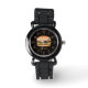 Destei's pattern of illustrated hamburgers that have sesame seed buns filled with cheese, lettuce, beef, tomato, ketchup and pickles. The clockface is made of orange colour numbers and the minutes and hours are shown with circles. The background colour is black, but it can be changed to any other colour, if so wished. There is also a personalizable text area for a name or other custom text.