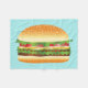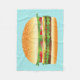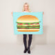 This blanket features a delicious cartoon illustration of a hamburger. The burger is made of meat, green lettuce, red tomatoes, onion, slice of cheese and a few pickles. The bun looks freshly baked and it has some sesame seeds on top of it.