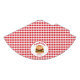 Destei's illustration of a hamburger that has a sesame seed bun that is filled with cheese, lettuce, beef, tomato, ketchup and pickles. The background has a red and white colour gingham pattern. There are also two personalizable text areas.