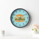 This clock features a delicious cartoon illustration of a hamburger. The burger is made of meat, green lettuce, red tomatoes, onion, slice of cheese and a few pickles. The bun looks freshly baked and it has some sesame seeds on top of it. The clock face is made of stylish black numbers.