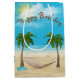 Hammock hanging between two tropical palm trees with starfish and flip-flops on ocean beach sand with summer clouds.