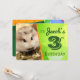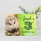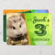 It's your birthday hamster invite card. Design with a furry white and brown hamster. The background is a colourful bright green geometric design. The back is decorated with colourful balloons floating up to the sky over green geometric shapes. Here, you can also put in detail information about the party: name, location, date, time, etc.
