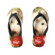 The flip flops arrived in a most colorful package which also had them double bagged in a black drawstring pouch which makes them great for gifting. They are a quality product with plenty of durability. The printing is vivid and true to that pictured on the web. Great look!
