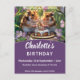 On this hamster-themed birthday party invitation postcard, two adorable golden Syrian hamsters are ready to celebrate a special birthday. The hamsters are cozily nestled among lush greenery and delicate purple flowers and balloons gently floating in the warm, sunlit background. The hamsters celebrate with a scrumptious birthday cake adorned with thick creamy icing and colorful sprinkles, topped with glowing candles ready for a birthday wish.generativecontent