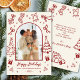 Whimsical Red Hand-Drawn Doodle Arch Photo Christmas Card. Send festive holiday wishes with this adorable hand-drawn scribble-style Christmas photo card. The front highlights playful maroon-red Christmas motifs and ribbon bows arranged around an arch photo frame, finished with a joyful Happy Holiday script and your family name on a soft ivory or cream background.