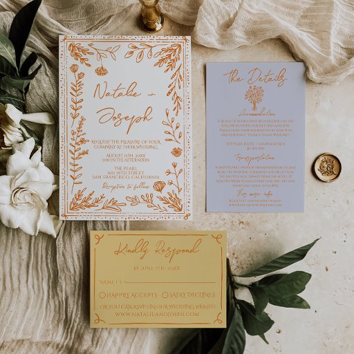 Hand Drawn Blue Orange Floral Wedding Details Enclosure Card