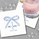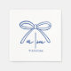 Personalised Hand Drawn Bow Whimsical Wedding Monogram Napkins. These personalised wedding cocktail napkins feature a clean and elegant design in timeless blue and white, perfect for adding a subtle touch of sophistication to your celebration. At the centre, a simple hand drawn bow is beautifully paired with the bride and groom's initials and wedding date, creating a timeless and understated look with European, Italian or French charm.