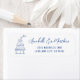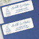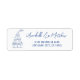 This elegant return address label features a simple champagne tower illustration on the left side, accented with soft blue tones. Your name is written in a graceful blue handwritten script, while the address appears in a classic blue serif font on the right. The design has a chic and celebratory feel, perfect for wedding invitations, bridal shower thank you notes, engagement parties, or any special event.