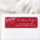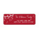 Festive Holiday Return Address Label. This cheerful design features a doodle swag of white greenery and hanging ornaments in the top left corner, with scattered white star doodles for a festive touch. Set on a rich red background, your name and address appear on the right in clean white fonts using a mix of handwritten script and serif styles for a modern yet classic look. Perfect for adding a festive accent to envelopes, fully customizable to match your style.