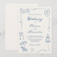 This fun quirky whimsical dusty blue and ivory coastal wedding invitation features a squiggle frame with hand drawn beach themed doodles, and hand written typography. The elegant yet casual coastal wedding design is perfect for seaside and destination weddings.