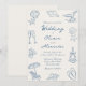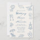 This whimsical coastal dusty blue and ivory wedding invitation is elegant with a relaxed seaside aesthetic, featuring a variety of hand drawn beach doodles framing the casual handwriting script.