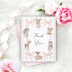 Say thank you to your baby shower guests with this stylish hand drawn pink coquette bows, ribbons, and a delicate blue and pink scallop lace design background. Cute hand painted woodland baby animals with soft blush pink roses adorn the pink ribbon border. Easily change the details to your own and if you would like to change the font style, size, colour and placement. See matching items in my Hand Drawn Coquette Ribbon Woodland Baby Shower Collection.