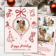 Whimsical Hand Drawn Christmas Motif 4 Photo Happy Holiday Christmas Card. Add a touch of festive charm to your holiday greetings with this adorable hand-drawn scribble Christmas photo card. The front features cute, playful red Christmas motifs arranged around a central ornament illustration with a bow, framing your main family photo, along with a cheerful Happy Holiday script and your family name—all set against a soft blush pink background.