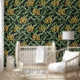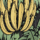 This exotic large-scale wallpaper features hand drawn yellow banana bunches and leaves in black ink, with cross-hatch detailing, all against an elegant almost black background. The background features a subtle pattern of raindrops in a lighter shade. Pattern size is 24" by 24"