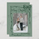 Send holiday cheer with this vertical Christmas card design. The front features a vertical photo in the center, framed by a swirling ribbon-style doodle border. A cute hand-drawn coquette bow sits in the top right corner, while “Merry Christmas” appears in a handwritten script at the top left. The bottom right includes space for your family’s last name or individual names, along with the year. The background is a soft sage green, with the doodle art and fonts in deep emerald green for a stylish and festive look.