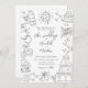 European Inspired Grey Hand-Drawn Quirky Sketches Whimsical Wedding Invitation. Perfect for couples seeking a creative, lighthearted touch with a European flair, this playful design stands out with a dynamic arrangement of large hand-drawn illustrations surrounding the text and flowing off the edges for an artistic and modern look. Styled in a refined grey palette, the design exudes a sense of personal charm while maintaining an elegant European touch.