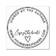 Signed by the author rubber stamp you can stamp your published books with before signing them to ensure your reader knows you signed it by hand. The stamp features curved text reading "signed by the author" at the top and your author's website on the bottom. Enjoy the book in a charming script above a hand-drawn heart with room left inside the round frame for you to sign by hand!