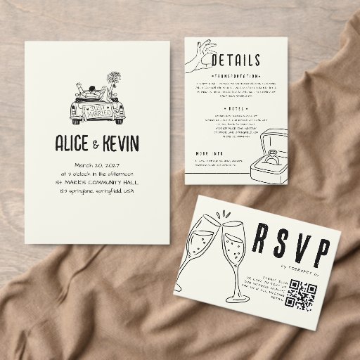 Hand Drawn Illustration Ivory Minimalist Wedding Invitation