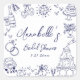 Personalised Hand-Drawn Quirky Bridal Shower Stickers. These fun and playful square bridal shower stickers feature quirky doodle illustrations surrounding the design, all in a navy blue theme. Elements like a champagne tower, wedding cake, disco ball, hearts, wedding bells, rings, cameras, and more create a whimsical and celebratory vibe.