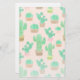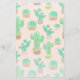 A pattern of various different types of cacti planted in different colours of pots. They are placed on a light pink background and are surrounded with cactus needle shapes. Each cactus is coloured with watercolours in bright green shades!