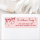 Festive Holiday Return Address Label. This cheerful design features a doodle swag of red greenery and hanging ornaments in the top left corner, with scattered red star doodles across a blush pink background for a festive touch. Your name and address appear on the right in red fonts using a mix of handwritten script and serif styles for a modern yet classic look.