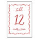Cute Hand Drawn Quirky Red Whimsical Wedding Table Number. This table number card features a charming hand drawn swirl and loop border, adding a playful yet refined touch to your event. The whimsical frame gently surrounds the table number, using a mix of script and handwritten style fonts to create a stylish and personal design inspired by Italian aesthetics. The fonts and artwork are red, paired with a simple white background for a clean and elegant look.