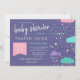 Charming baby shower invitation in beautiful hues of pink, purple, and teal with hand-drawn clouds, raindrops, and stars. Baby shower is written in a pretty brush script. Add your details in a modern thin font. The back has preppy stripes in white and bright turquoise.