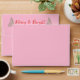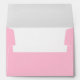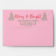a vintage retro minimalist simple red pink and green Merry Christmas trees holiday envelope. As you see it features a plain pink colour background with green handwritten script typography of Return address info. And you got red merry & bright calligraphy . Along with the your customisable return address. And hand drawn green Christmas trees made of ribbon bows.