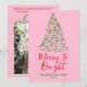 If you are looking for a simple minimalist beautiful and easy editable Christmas card. This one is perfect for you. And as you see the design features a green hand made and drawn Christmas tree made of ribbons. With red hand written typography of MERRY & BRIGHT and pink background. And your family name and year under it. And In the back you got a a customisable Christmas greeting and family photo and green ribbon above.