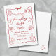 Quirky Hand Drawn Whimsical Wedding Invitation. This artistic and playful design is perfect for couples looking to infuse their big day with a creative, lighthearted vibe. Styled in a red and white colour palette, it feels like a personal, hand drawn masterpiece that is both charming and unique. A swirling, wavy frame adorned with a dainty bow draws attention to your wedding details, presented in a mix of script and handwritten style fonts for a relaxed yet elegant touch.