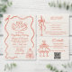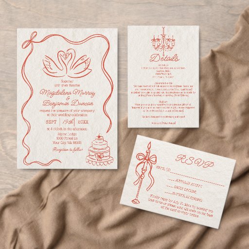 Whimsical hand-drawn retro-style wedding design in sunset orange with ribbon bow frame, champagne flute tower and a wedding cake, paired with hand-lettered, typewriter and vintage serif fonts.