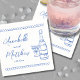 Personalised Hand Drawn Champagne Whimsical Wedding Napkins. This elegant and minimalist wedding cocktail napkin features a charming hand drawn illustration of a champagne bottle and glass, perfect for celebrating your special occasion. In soft blue and white tones, the bride and groom's names and wedding date are elegantly displayed beneath the artwork in a mix of handwritten script and simple fonts, creating a stylish yet approachable vibe.