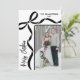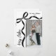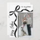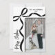 Send holiday cheer with this vertical Christmas card featuring a modern, slightly off-center layout. The photo sits in the bottom right corner, extending off the edge for a simple, contemporary look. A hand-drawn coquette bow rests in the top left, with ribbon lines running along the top and down the left side for a soft decorative touch. “Merry Christmas” appears vertically along the bottom left, adding a fun focal point. Your family name and date sit in the top right to keep things balanced.