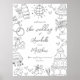 Adorning the sign are hand-drawn illustrations of a sparkling disco ball, wedding bells, a vintage camera, a champagne tower, a tiered cake, flowers, hearts, and a "Just Married" car. These playful and whimsical sketches create a unique, creative vibe while maintaining an elegant aesthetic with soft grey accents for a subtle, timeless charm.