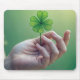A hand delicately holds a four-leaf clover against a soft, blurred green background
