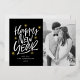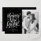 Celebrate the new year with these stylish New Year cards, featuring "Happy New Year" elegantly written in a white hand-lettered script, surrounded by shimmering gold foil stars and dots on a bold black background. Add your photo, name, and the year to the front for a personal touch that makes this design uniquely yours. Perfect for sending festive wishes, this custom gold foil New Year card blends modern elegance with a hint of sparkle, ensuring your greetings leave a lasting impression.