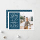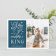 Modern typography based holiday photo card features your favourite photo with "Glory to the newborn king" alongside in white hand lettered style typography. Personalise with your family name, individual names and/or your custom Christmas message. Cards reverse to a pattern of white snow and stars on a rich dark teal blue background.