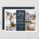 Modern typography based holiday photo card features four of your favourite photos in a square format, with "Glory to the newborn king" centred in white hand lettered style typography on rich midnight navy blue. Personalise with your family name, individual names and/or your custom Christmas message. Cards reverse to a pattern of white snow and stars on a matching dark blue background.