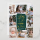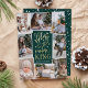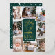Beautiful typography based religious holiday photo card features eight of your favourite family photos arranged in a collage layout. "Glory to the newborn king" appears in the centre in gold foil hand lettered typography on a hunter green background dotted with festive stars. Personalise with your family name beneath.