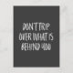 Don't Trip Over What Is Behind You in black and white hand lettering.