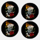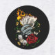 Original vector art of a hand holding playing cards that are on fire. With gold coins, dice, 8 Ball, Ribbon and a rose.