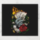 Original vector art of a hand holding playing cards that are on fire. With gold coins, dice, 8 Ball, Ribbon and a rose.