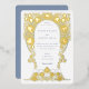 This elegant wedding invitation showcases an intricate, hand-painted floral design in soft blue, featuring a baroque-style border that elegantly frames the couple's names and wedding details. The delicate floral motifs add a sense of vintage charm, while the modern serif typography provides a contemporary touch. The back of the card features a minimalist monogram adorned with complementary floral elements, all set against a calming blue background. Perfect for couples seeking a timeless yet stylish wedding theme, this invitation combines the beauty of traditional artistry with modern design. The colour palette of soft blue and white adds a serene and sophisticated feel to your special day.