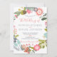 Flowers wedding invitation template with an adorable hand drawn floral wreath in shades of coral red, ocean blue, fern and sage green and blush with blooms and foliage and with a fancy modern contemporary changeable script text. -------- The invitation is ideal for country rustic spring or summer | floral garden | elegant outdoor or backyard weddings.