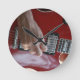 Hand playing red electric guitar near pickup round clock