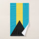 Crafted with meticulous attention to detail, this hand towel celebrates the vibrant spirit of the Bahamas. The design proudly showcases the iconic aquamarine and gold stripes with a black triangle and white stripes, symbolising the nation's tropical beauty and maritime heritage.